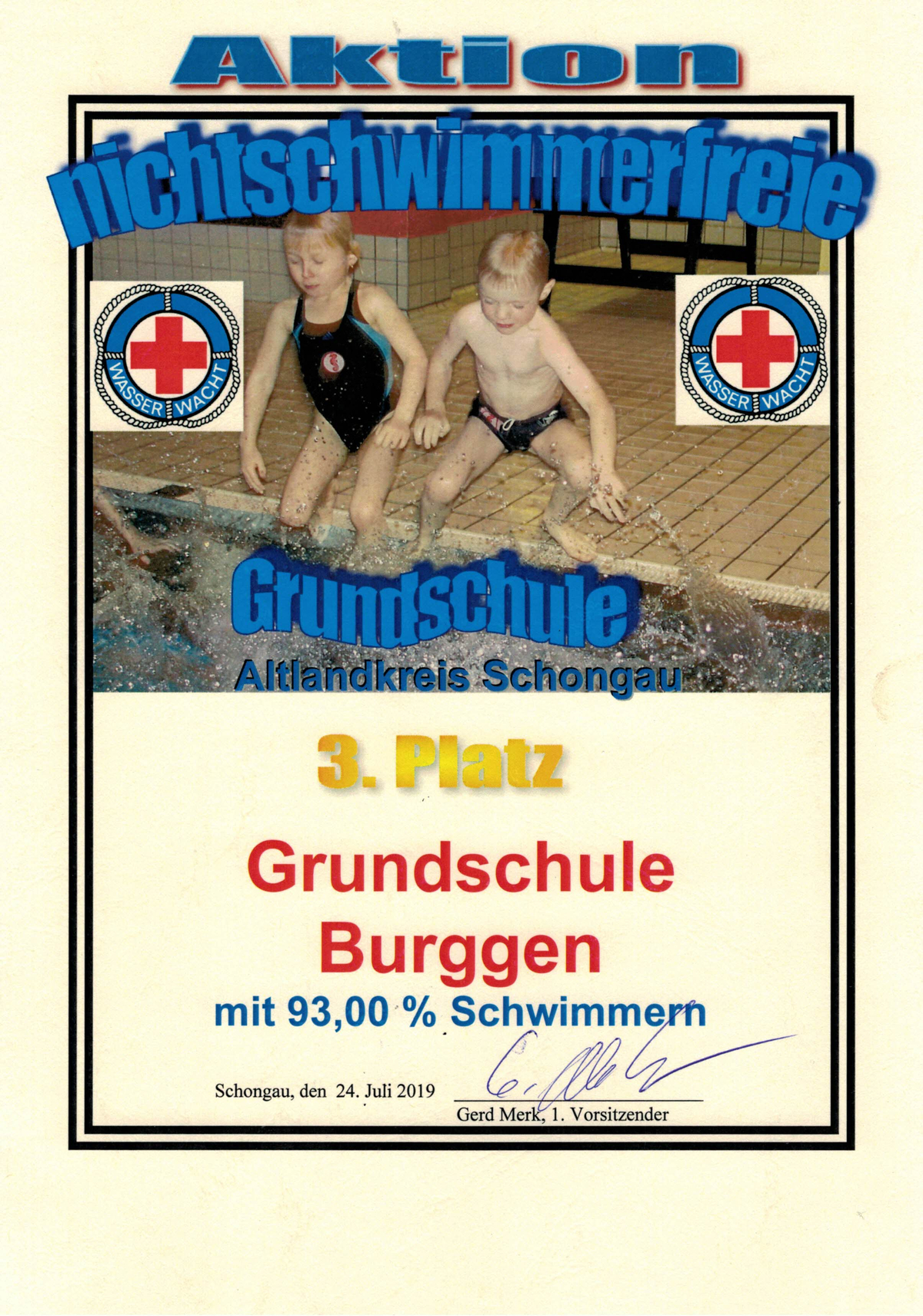 Die Wasserwacht Peiting-Schongau veranstaltet nun schon zum 10. Mal den Wettbewerb „Nichtschwimmerfreie Grundschule“ mit dem Ziel, dass alle Kinder spätestens in der 4. Klasse das Schwimmen erlernen. Der Grundschule Burggen gelang es dieses Jahr einen hervorragenden dritten Platz zu belegen. Mit 93% Schwimmkindern musste sich Burggen nur der Grundschule Altenstadt (95%) und Hohenfurch (97%) geschlagen geben.