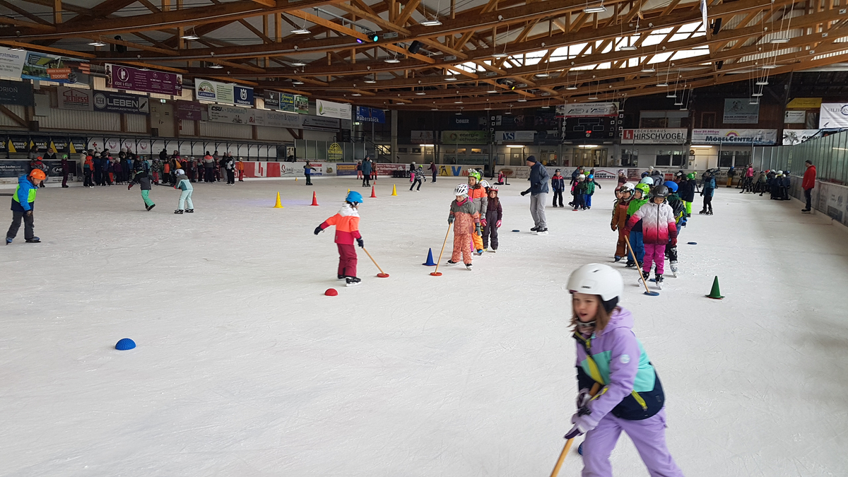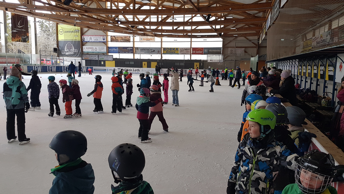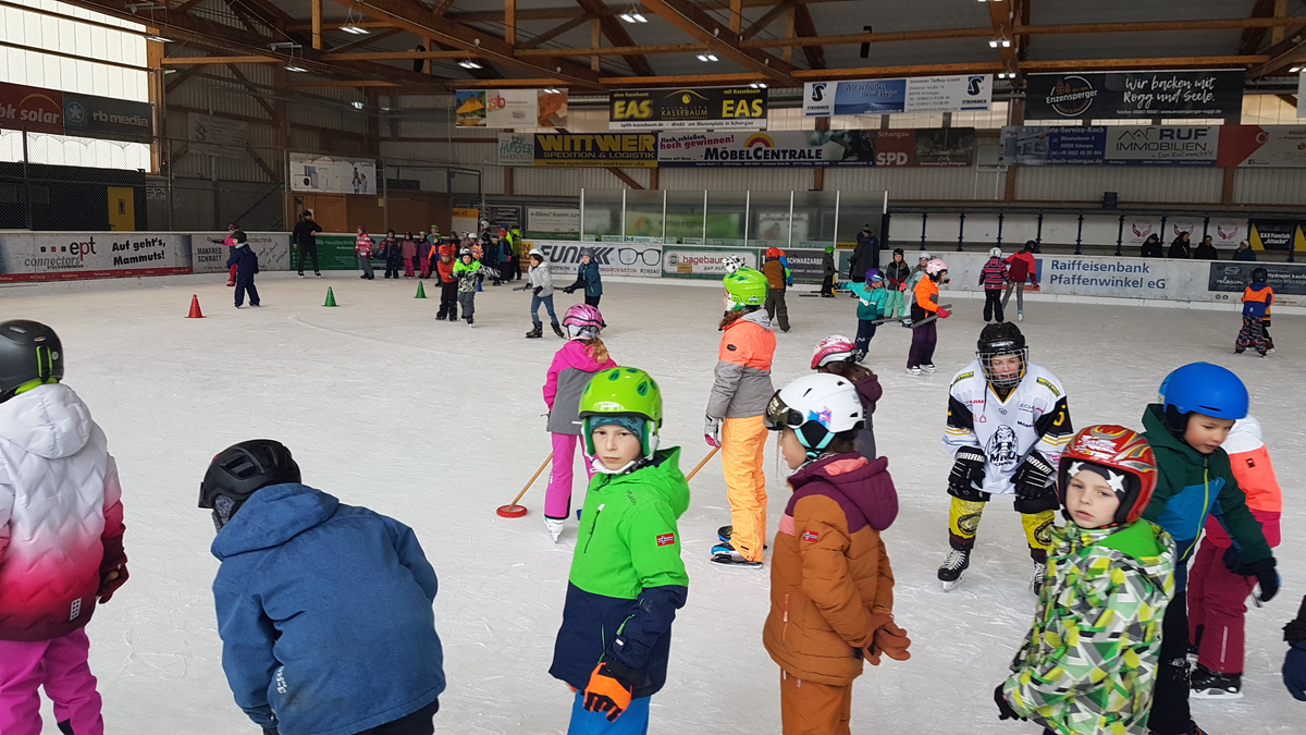 In der Eishalle ging es dann hoch her. In einem abgegrenzten Bereich probierten die Anfänger die ersten Schritte auf dem Eis aus. Für die fortgeschrittenen Fahrer gab es eine kleine „Eisdisco“ und im Anschluss verschiedene Stationen, bei denen Spaß und Geschick im Vordergrund standen. Viel zu schnell musste Herr Saidl die „letzte Runde“ verkündigen.