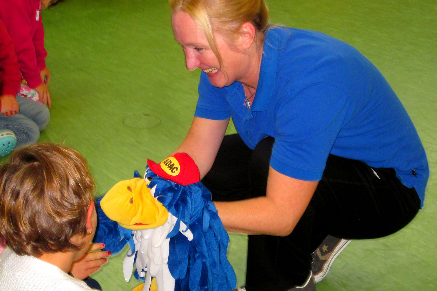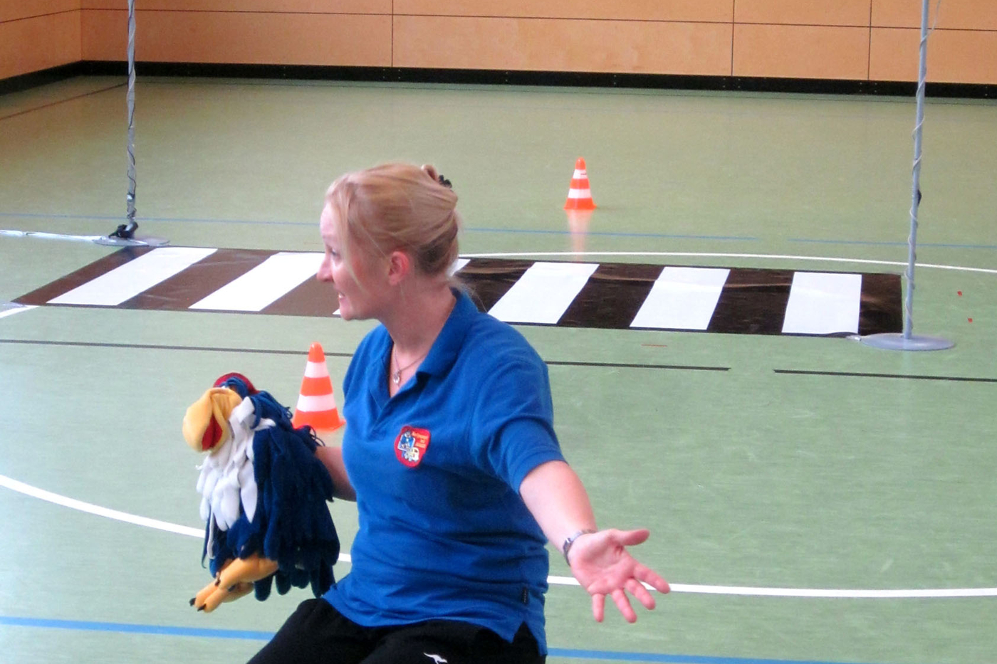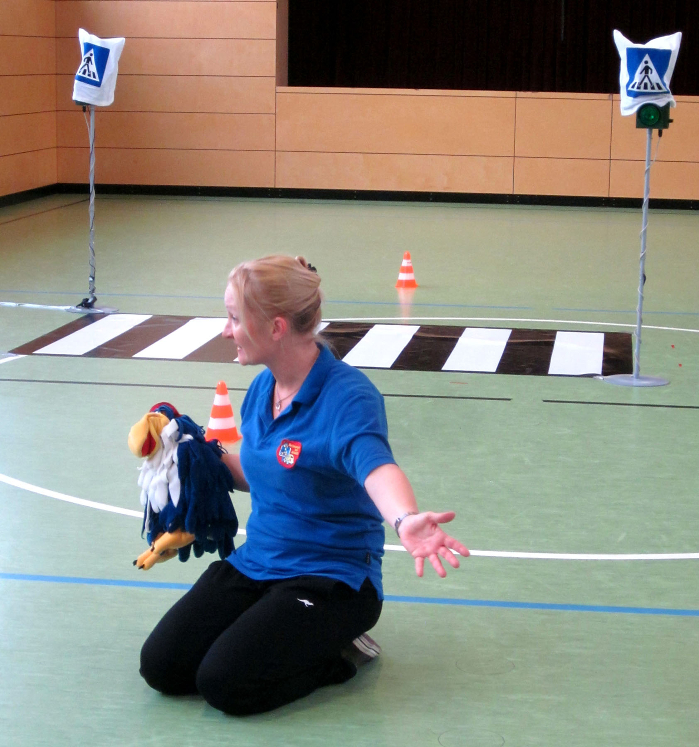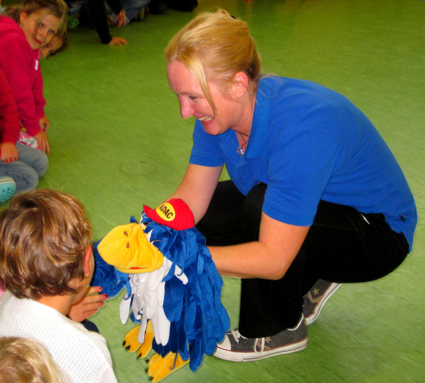 Im Rahmen der Verkehrserziehung kommt jedes Jahr Frau Stork in die 1. und 2. Klasse. Mit der Handpuppe "Adacus" übt sie mit den Kindern lebendig und anschaulich das richtige Überqueren der Straße.