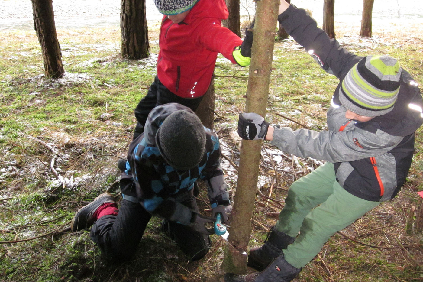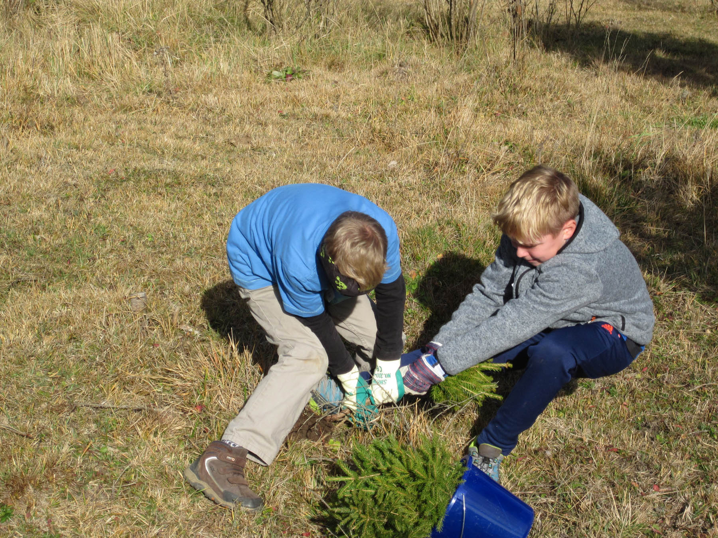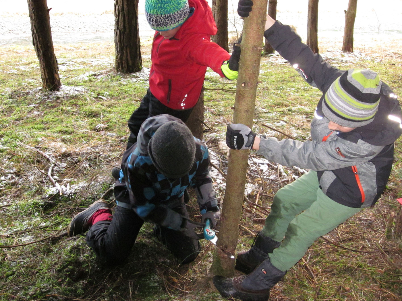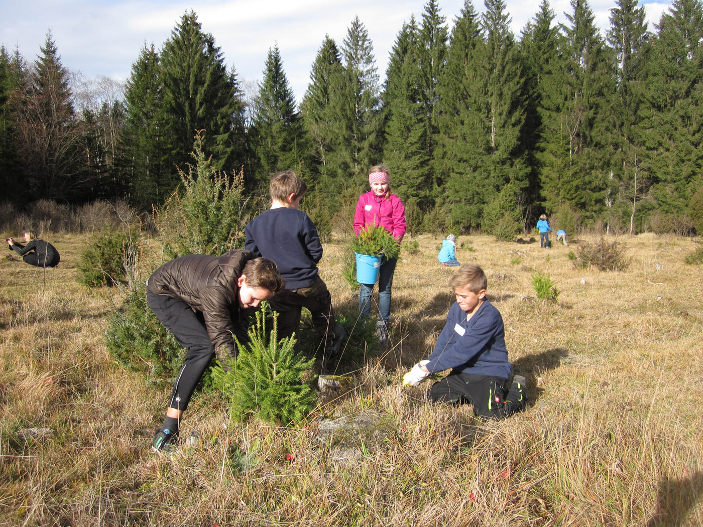 Bei der Entbuschung der Wacholderweide machen wir uns gezielt auf die Suche nach Fichten. Sie sind dort nicht erwünscht. Das Fällen der jungen Bäume bereitet den Viertklässlern besonders viel Freude, wenn sie die schönsten Exemplare als Christbäume mit nach Hause nehmen dürfen. So können die Kinder für den Heiligabend dann ihren selbst gefällten Weihnachtsbaum schmücken.